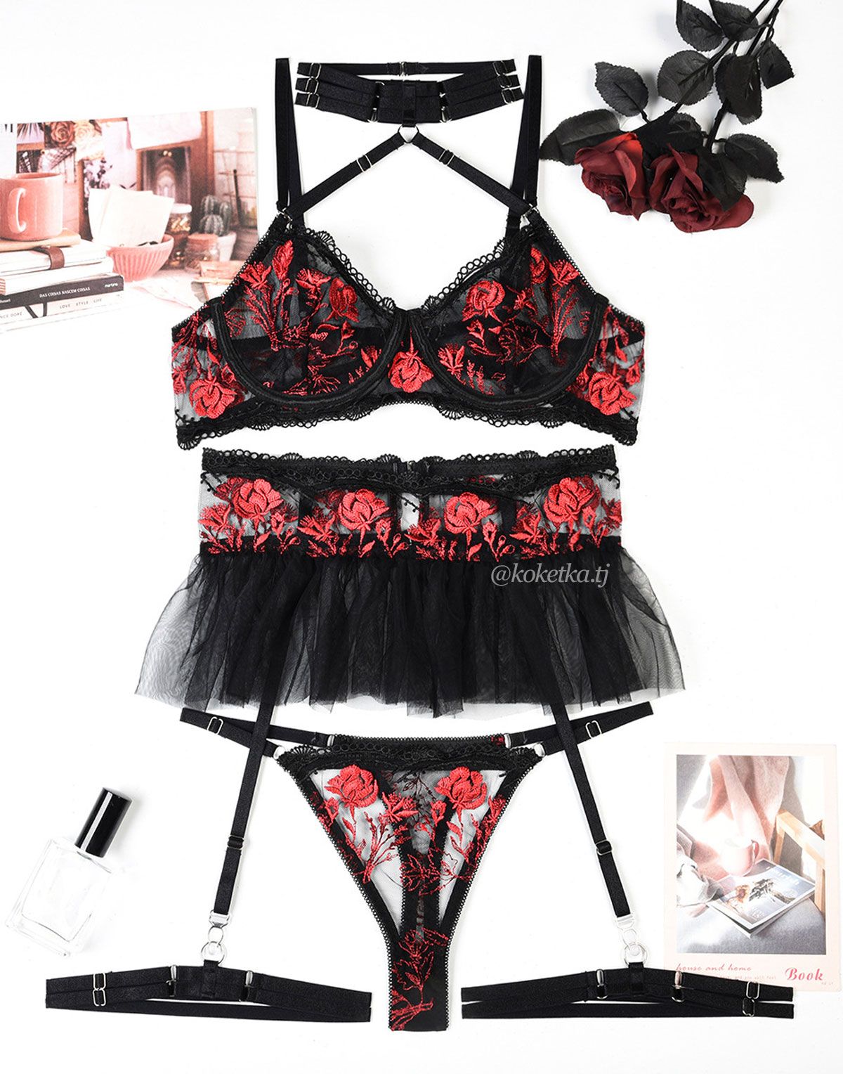 бюстгальтер, наножники для ног, трусики стринг, чокер, юбка